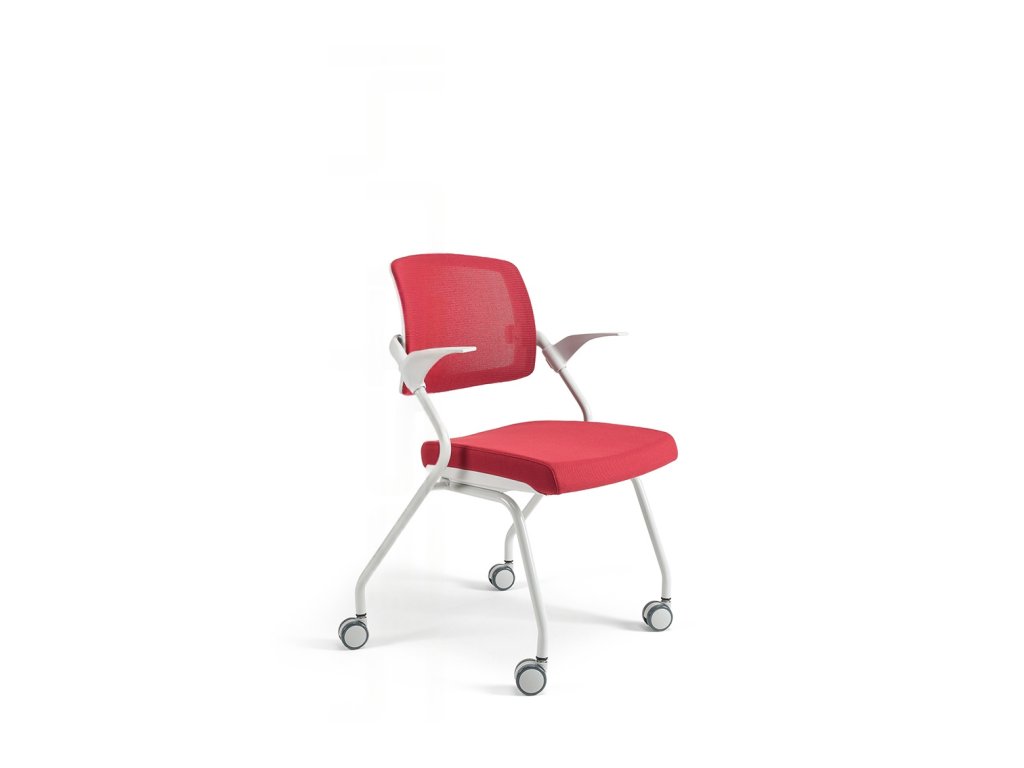 Jednací židle - pevný ocelový rám skluzného typu, nosnost 120 kg, výkyvný opěrák a sklopný sedák, stohovatelná jednací židle, pevné područky, pevná kovová konstrukce, plastová a pogumovaná kolečka, materiál potahu textil a síťovina, rozměry 61 × 55 cm (Š×H)