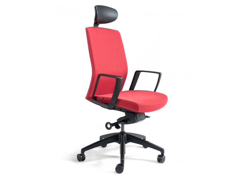 Kancelářská židle - otočná se synchronní mechanikou, nosnost 120 kg, sedák s nastavitelností hloubky a výšky, tvarovaný opěrák s nastavitelným sklonem, pevné područky, nastavitelný podhlavník, nastavitelná bederní opěrka, plastová a pogumovaná kolečka o průměru 6,5 cm, plastová konstrukce, materiál potahu textil, rozměry 68 × 59 cm (Š×H)