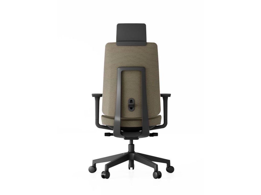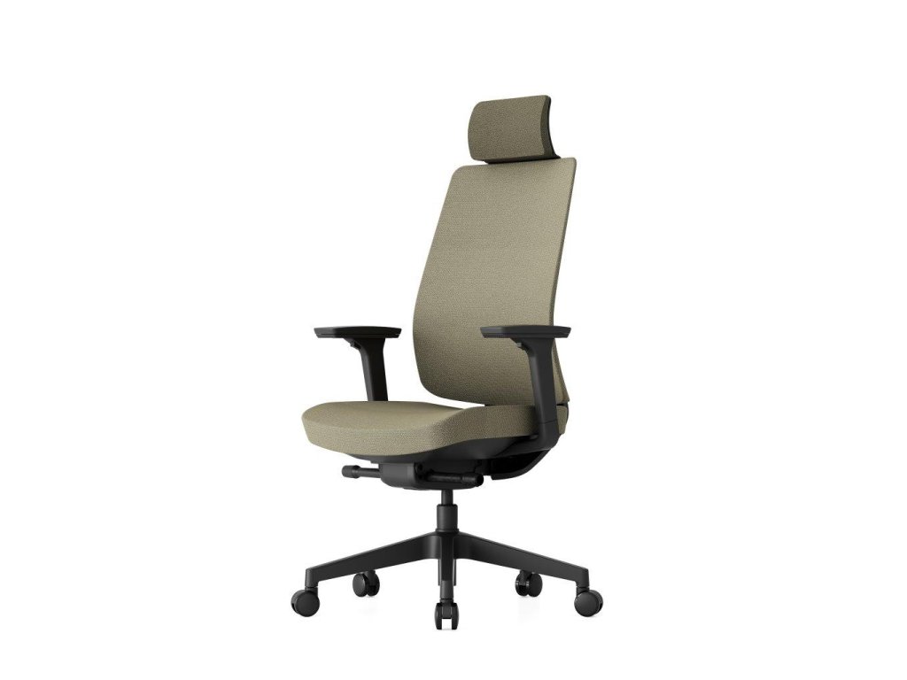 Kancelářská židle - otočná se synchronní mechanikou, nosnost 120 kg, tvarovaný sedák s nastavitelností hloubky a výšky, vytvarovaný opěrák s nastavitelným sklonem, područky s možností nastavení ve více směrech, nastavitelný podhlavník, nastavitelná bederní opěrka, plastová a pogumovaná kolečka o průměru 6,5 cm, plastová konstrukce, materiál potahu textil, rozměry 69 × 75 cm (Š×H)