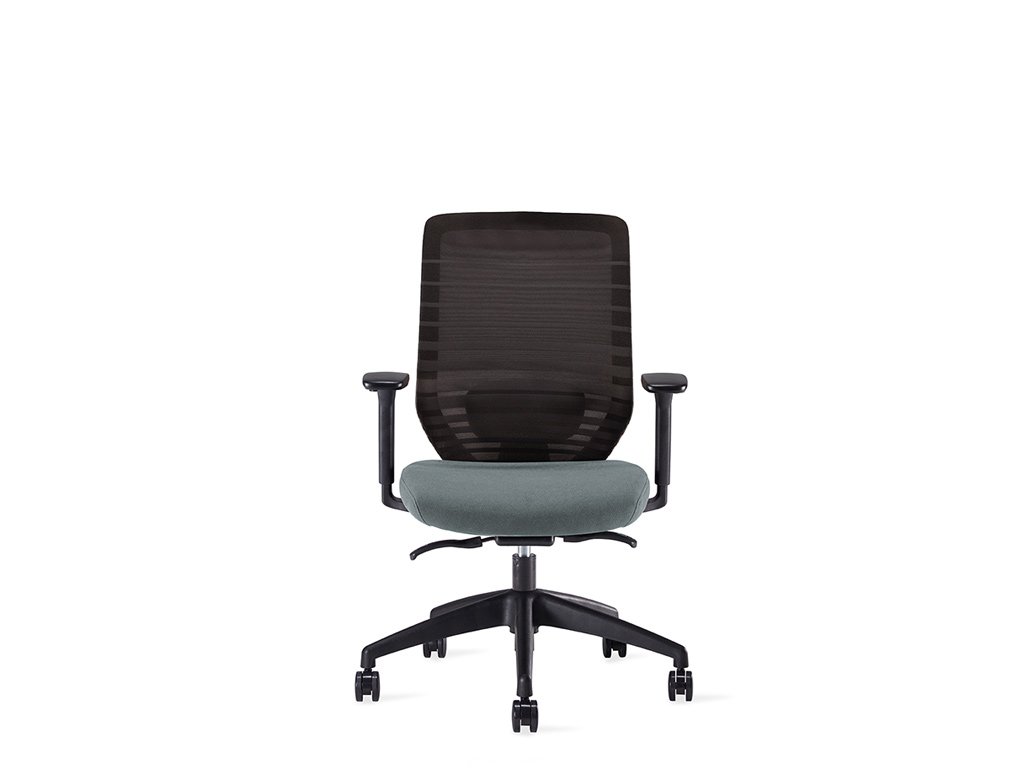 Kancelářská židle - otočná se synchronní mechanikou, nosnost 120 kg, sedák s nastavitelností hloubky a výšky, bederní opěrka, opěrák s nastavitelným sklonem, područky s možností nastavení výšky, plastová a pogumovaná kolečka o průměru 6,5 cm, plastová konstrukce, materiál potahu sedáku textil a opěráku síťovina, rozměry 66 × 57 cm (Š×H)