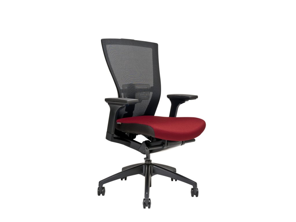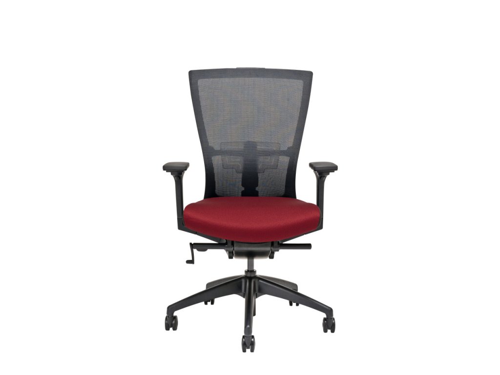 Kancelářská židle - otočná se synchronní mechanikou, nosnost 120 kg, tvarovaný sedák s nastavitelností hloubky a výšky, vytvarovaný opěrák s nastavitelným sklonem, područky s možností nastavení ve více směrech, nastavitelná bederní opěrka, plastová a pogumovaná kolečka o průměru 6,5 cm, plastová konstrukce, materiál potahu textil a síťovina, rozměry 68 × 60 cm (Š×H)