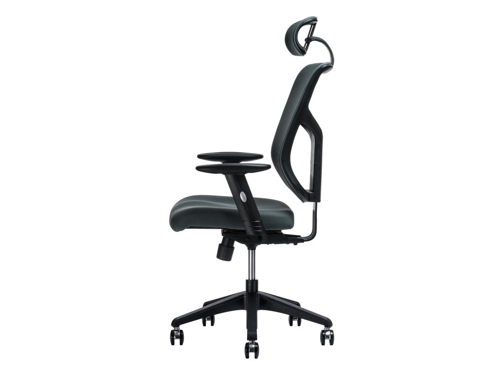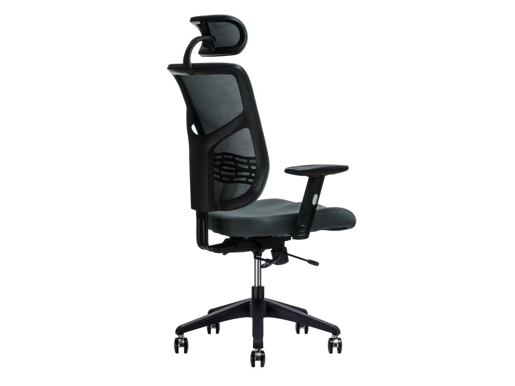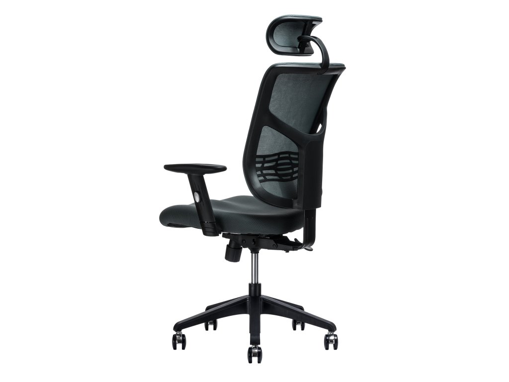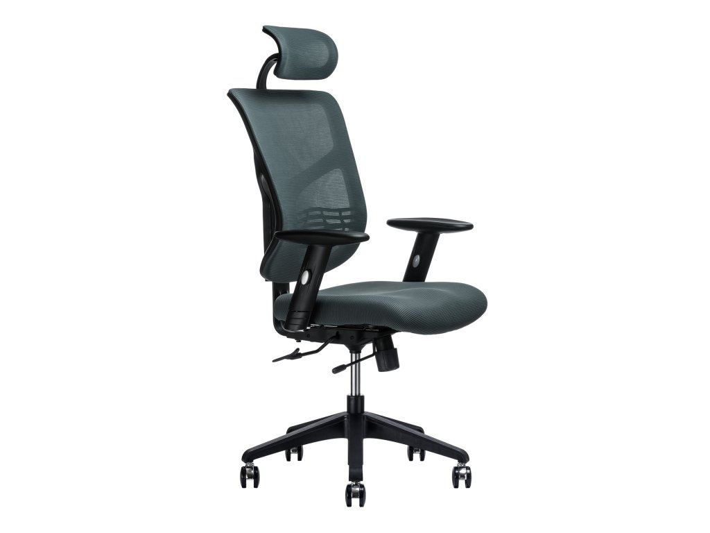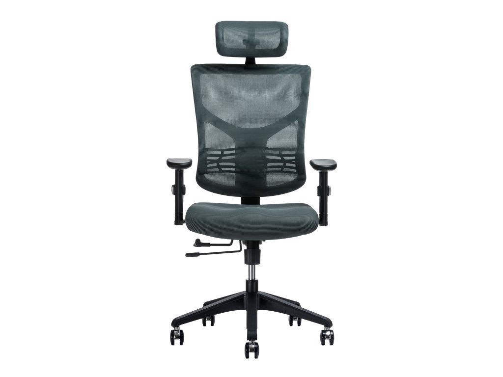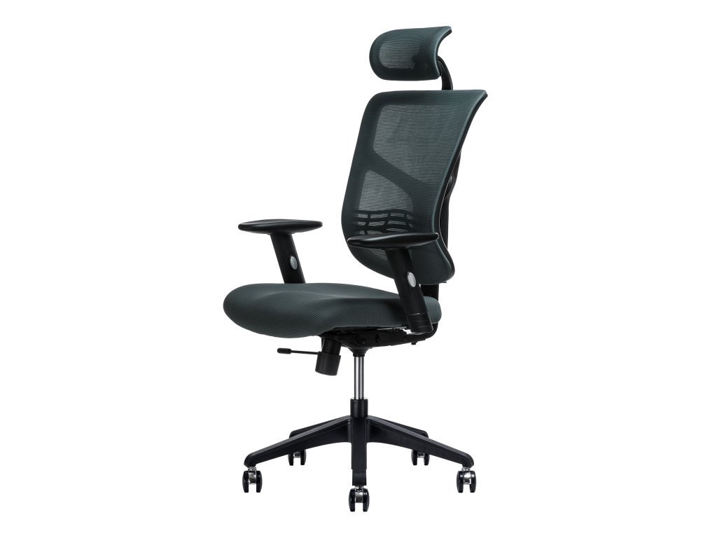 Kancelářská židle - nastavitelný podhlavník, otočná se synchronní mechanikou, nosnost 120 kg, anatomicky tvarovaný sedák s nastavitelností hloubky a výšky, bederní opěrka, opěrák s nastavitelným sklonem, opěrák s možností nastavení výšky, područky s možností nastavení výšky, plastová a pogumovaná kolečka o průměru 6,5 cm, plastová konstrukce, materiál potahu síťovina, rozměry 67 × 56 cm (Š×H)