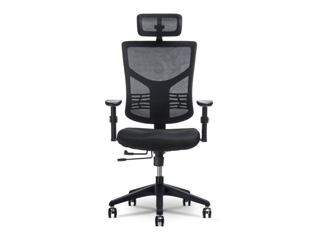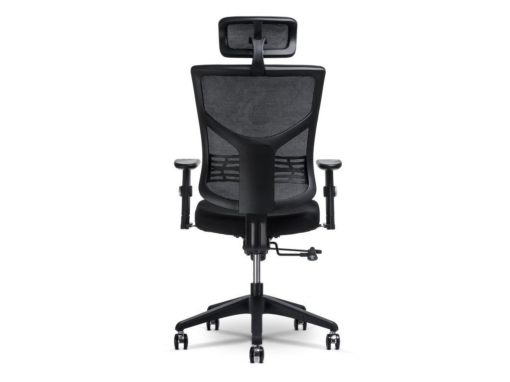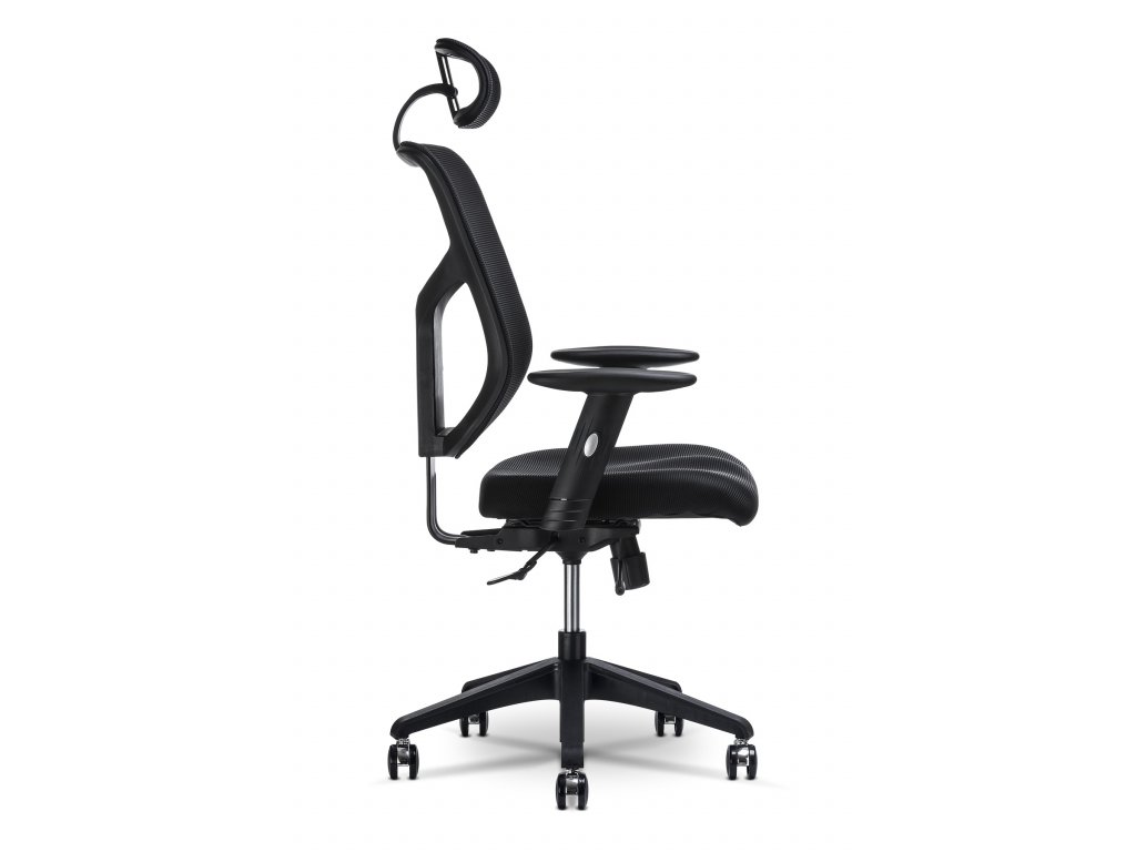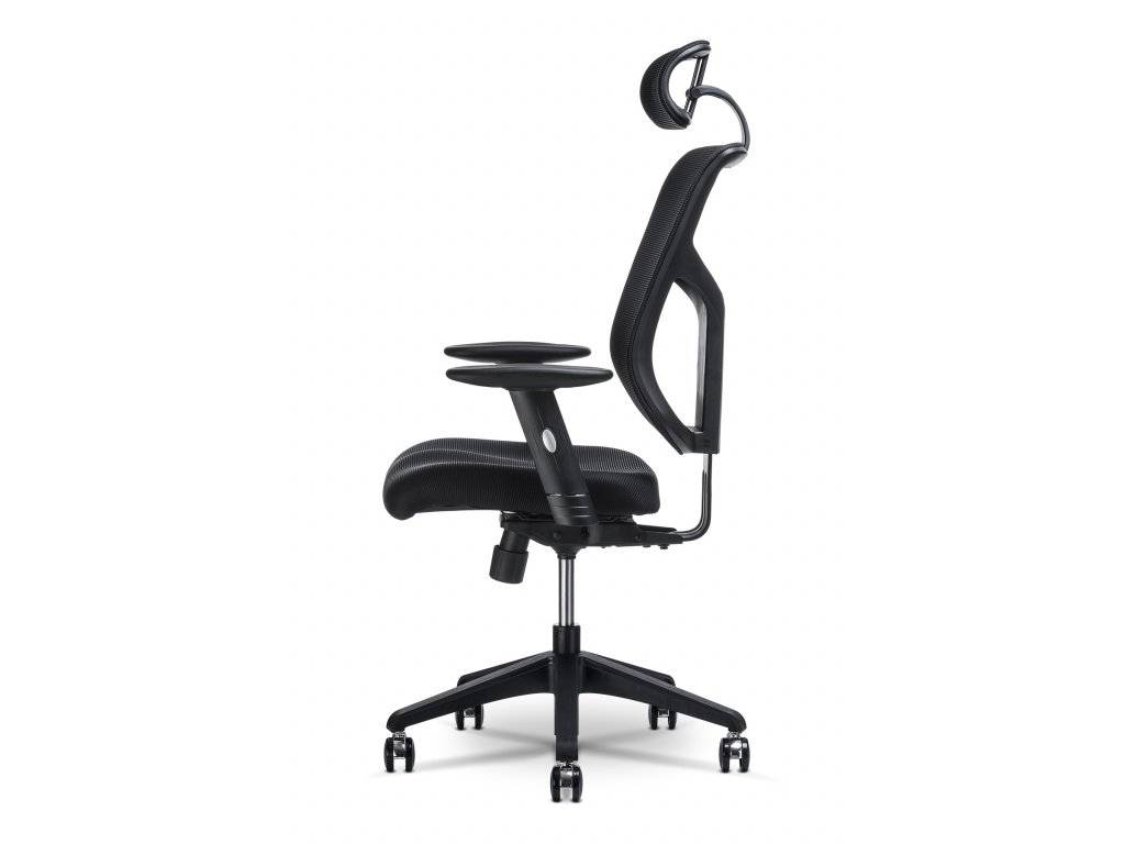 Kancelářská židle - nastavitelný podhlavník, otočná se synchronní mechanikou, nosnost 120 kg, anatomicky tvarovaný sedák s nastavitelností hloubky a výšky, bederní opěrka, opěrák s nastavitelným sklonem, opěrák s možností nastavení výšky, područky s možností nastavení výšky, plastová a pogumovaná kolečka o průměru 6,5 cm, plastová konstrukce, materiál potahu síťovina, rozměry 67 × 56 cm (Š×H)