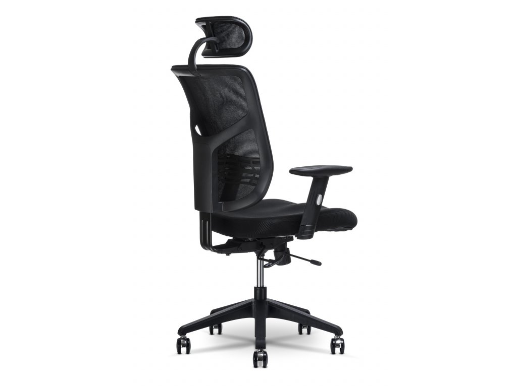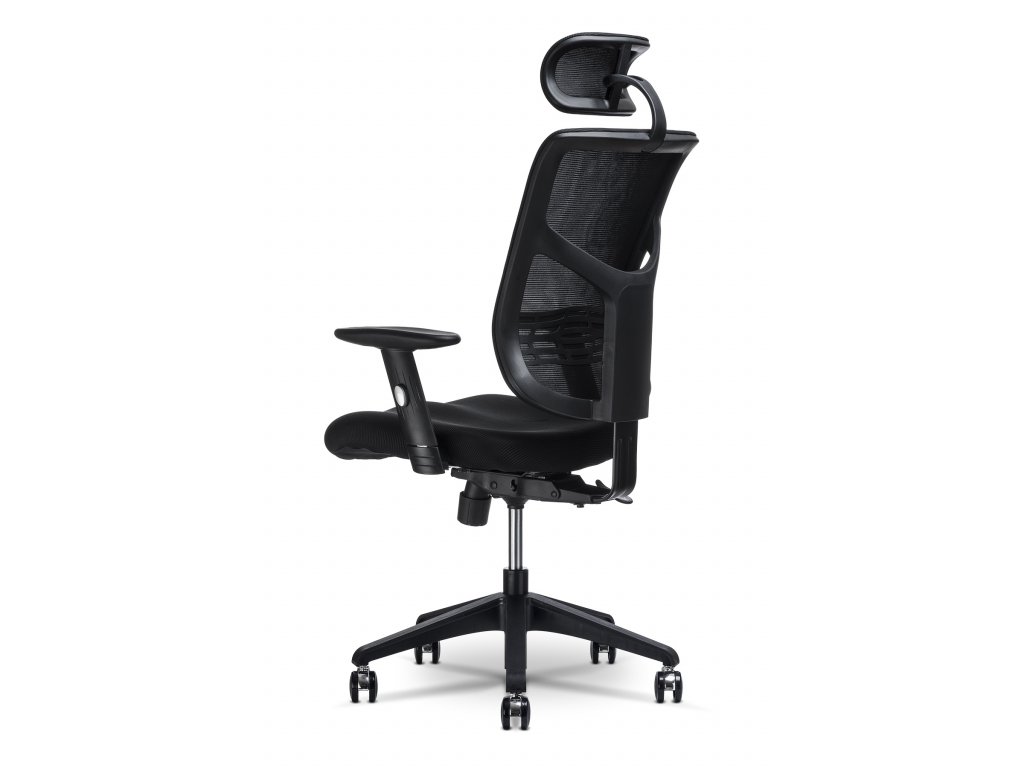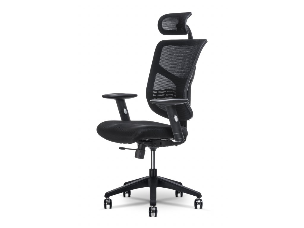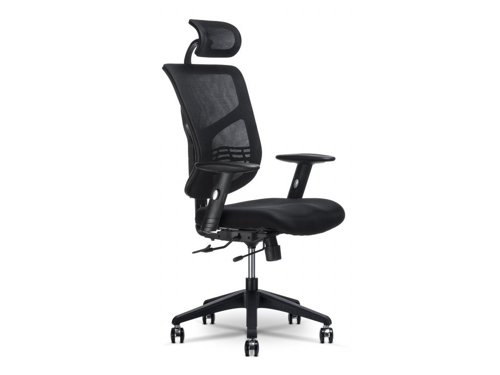 Kancelářská židle - nastavitelný podhlavník, otočná se synchronní mechanikou, nosnost 120 kg, anatomicky tvarovaný sedák s nastavitelností hloubky a výšky, bederní opěrka, opěrák s nastavitelným sklonem, opěrák s možností nastavení výšky, područky s možností nastavení výšky, plastová a pogumovaná kolečka o průměru 6,5 cm, plastová konstrukce, materiál potahu síťovina, rozměry 67 × 56 cm (Š×H)