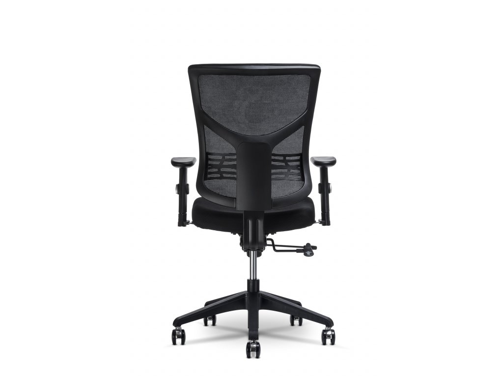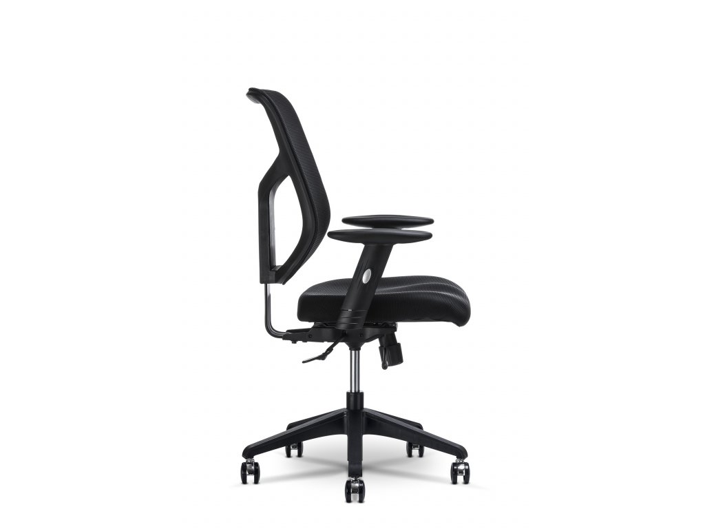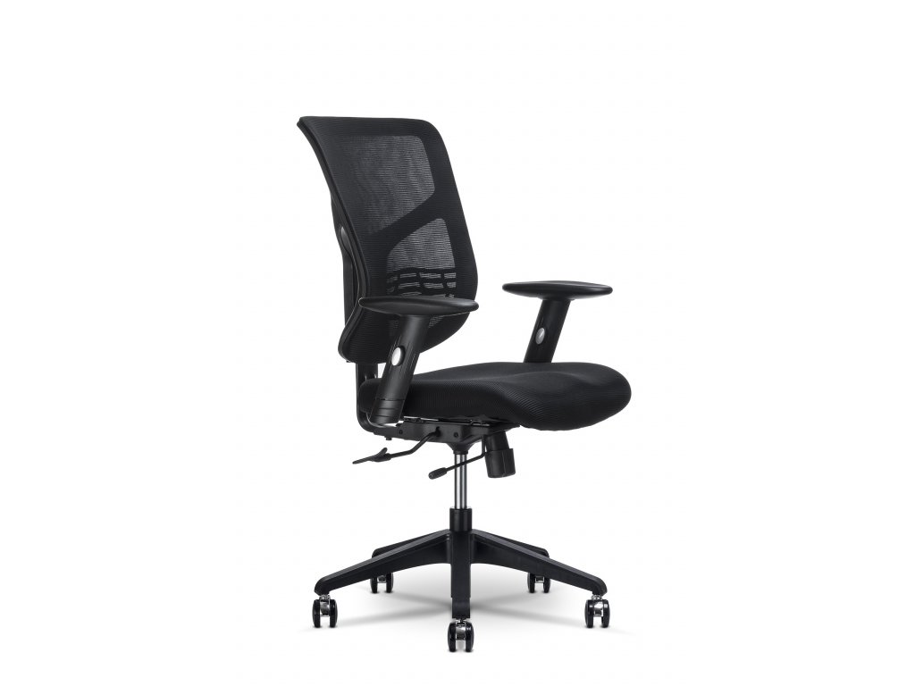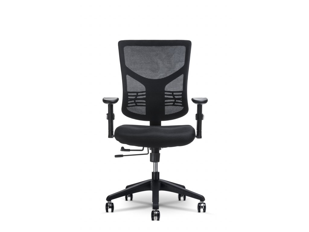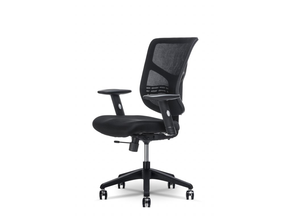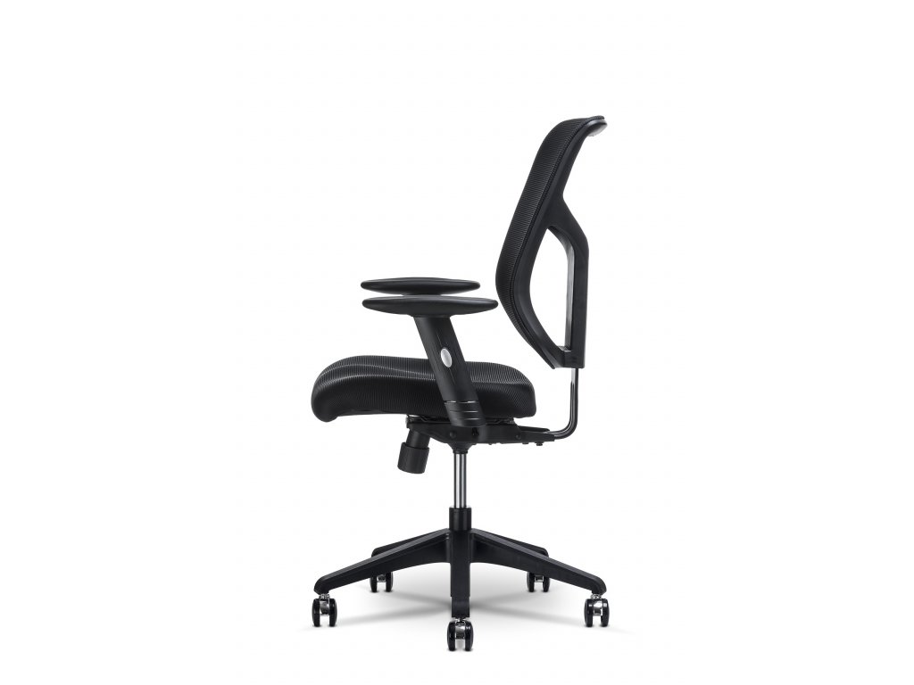 Kancelářská židle - otočná se synchronní mechanikou, nosnost 120 kg, anatomicky tvarovaný sedák s nastavitelností hloubky a výšky, bederní opěrka, opěrák s nastavitelným sklonem, opěrák s možností nastavení výšky, područky s možností nastavení výšky, plastová a pogumovaná kolečka o průměru 6,5 cm, plastová konstrukce, materiál potahu síťovina, rozměry 67 × 56 cm (Š×H)