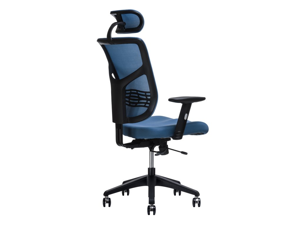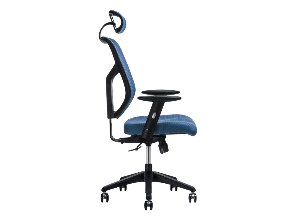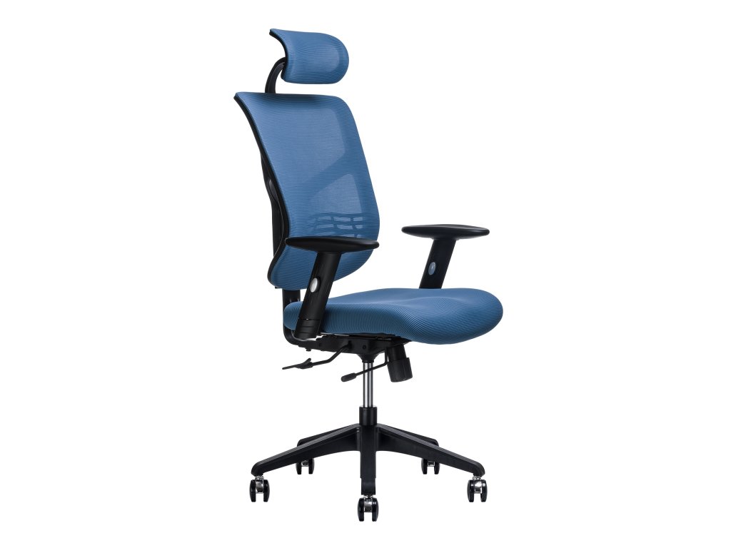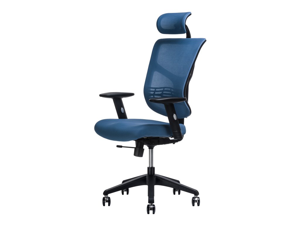 Kancelářská židle - nastavitelný podhlavník, otočná se synchronní mechanikou, nosnost 120 kg, anatomicky tvarovaný sedák s nastavitelností hloubky a výšky, bederní opěrka, opěrák s nastavitelným sklonem, opěrák s možností nastavení výšky, područky s možností nastavení výšky, plastová a pogumovaná kolečka o průměru 6,5 cm, plastová konstrukce, materiál potahu síťovina, rozměry 67 × 56 cm (Š×H)